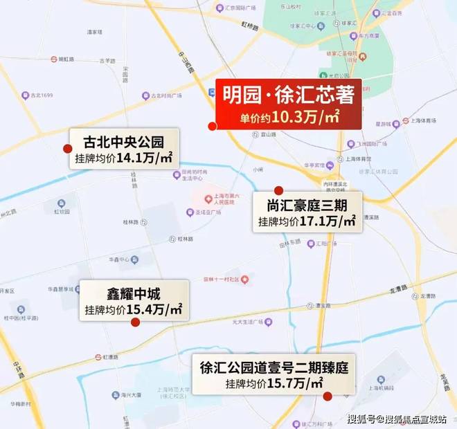 明园·徐汇芯著东侧的尚汇豪庭挂牌均价约17.1万/㎡;其他内中环的次新房挂牌均价普遍在15万+/㎡;西侧大古北的次新房,挂牌均价也达到14万+/㎡。