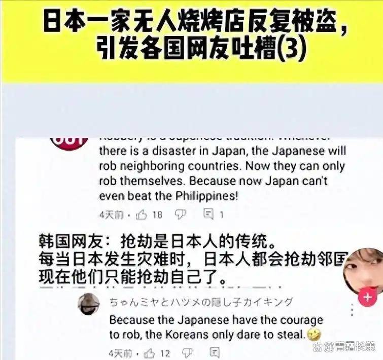 另一场争议的导火索,是一起日本无人烧烤店频繁遭遇盗窃的事件。一些韩国网友借此机会冷嘲热讽,声称“抢劫是日本的传统艺能”,并揶揄日本过去常趁邻国危难之际掠夺资源,如今却是“自抢自”。日本网民立即反击,指出日本民众敢于公开实施抢劫,而韩国人似乎更擅长小偷小摸,做些不齿的勾当,其行为令人难以启齿。这场关于窃贼与劫匪的对峙,实际上构成了一场充满戏剧张力的精彩戏码。尽管整个争论中没有一句直接提及中国,但每句话的背后,似乎都隐约浮现出与中国的关联。