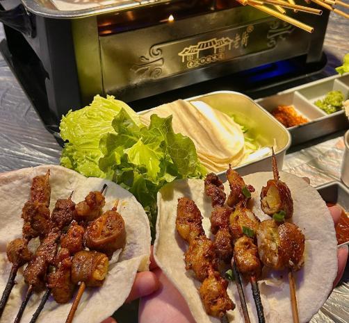 随后李教授就来到饭店,坐下先点了100串烤肉,这100串烤肉啥样都有,随后还点了两瓶白酒,李教授平时也爱喝酒,自己一人也能喝两瓶,这也是多年酒局练出来了,不一会烤肉就上来了,淄博这边烧烤有意思,都是自己烤着吃,还有搭配的小饼和大葱,蘸酱卷着烤肉特香。